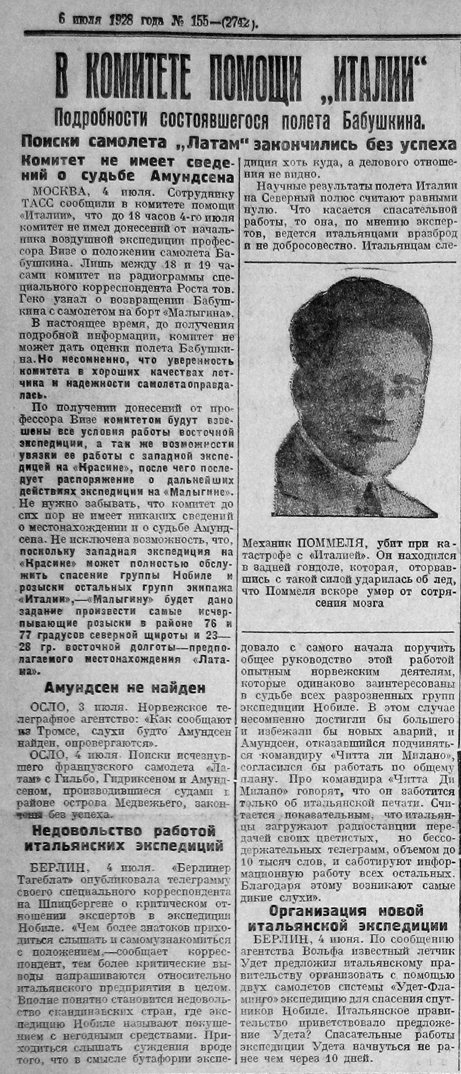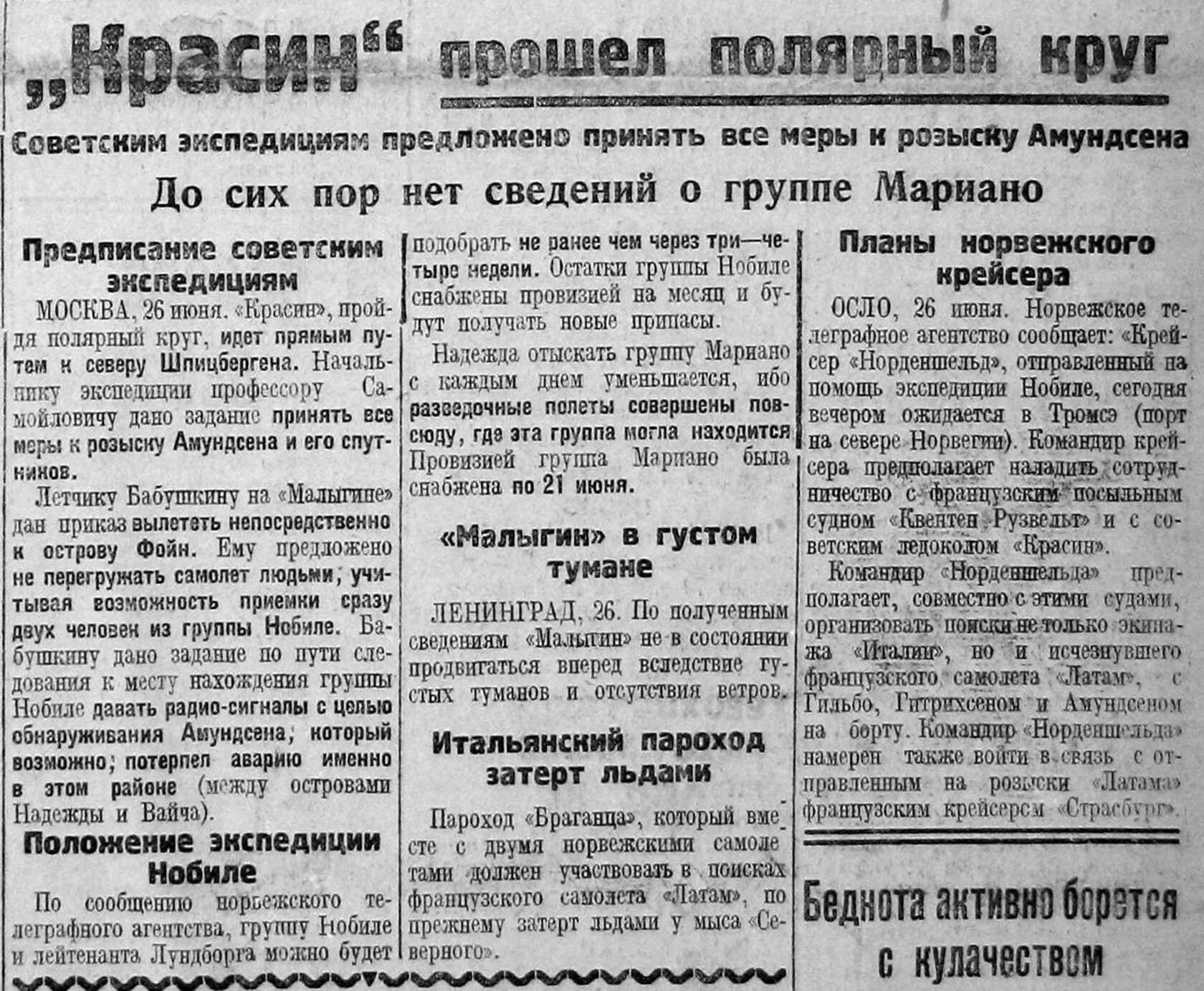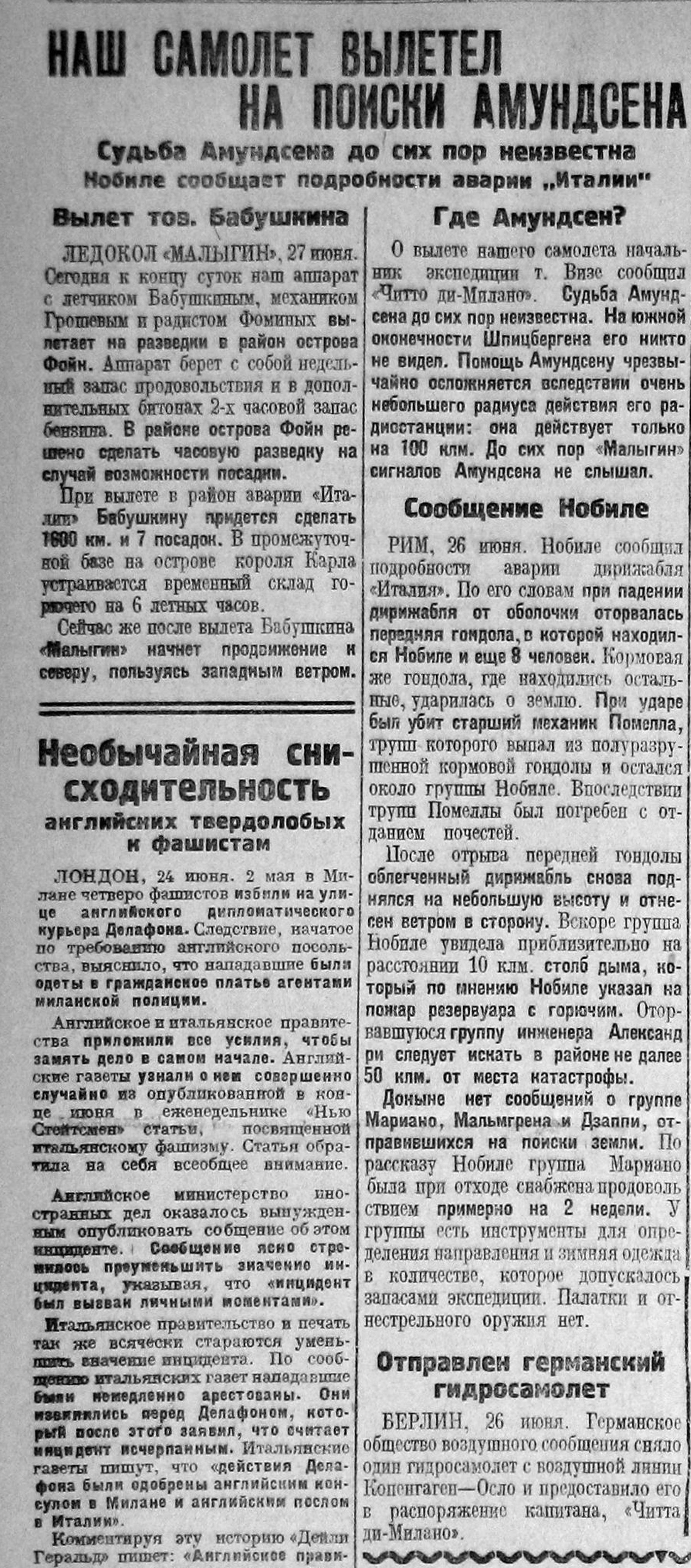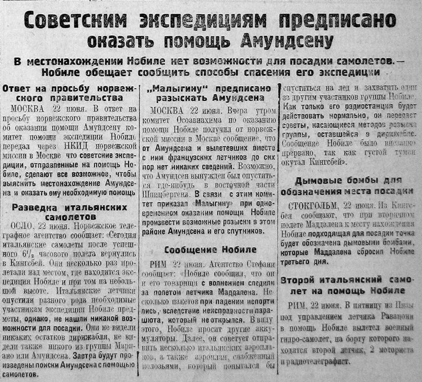 На приобретённом в Италии дирижабле к Шпицбергену вылетел Нобиле с частью команды, а Амундсен отправился на север по суше, чтобы заранее подготовить для дирижабля площадку. Одна из остановок «Норвегии» предполагалась в окрестностях Ленинграда, в Гатчинском районе. Поэтому между СССР и Норвегией произошёл обмен вербальными нотами относительно полёта дирижабля над нашей территорией.