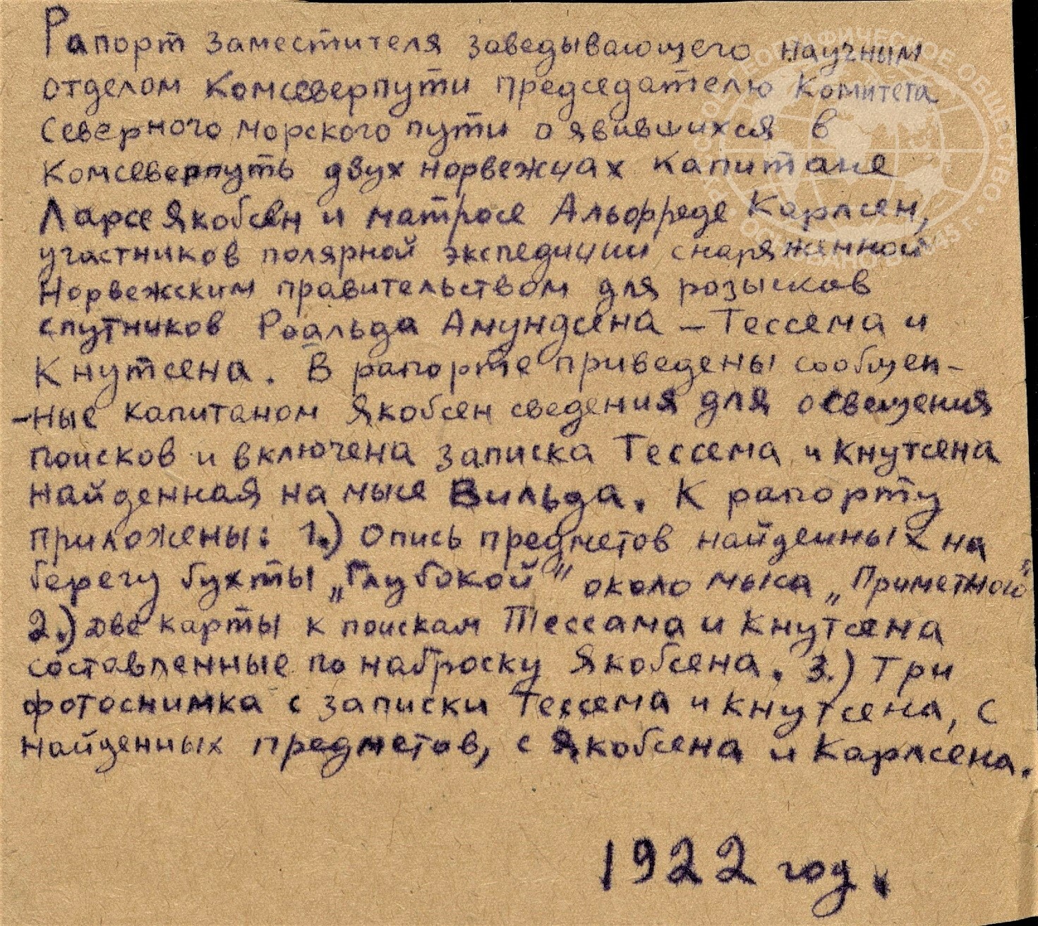 «Это был русский юноша, высокий и очень худой, белокурый, с небесно-голубыми глазами. Он никогда не улыбался, что делало его на вид довольно суровым, но душа у него была прекрасная. Во время долгого пути из Рима в Кингсбей он отлично справлялся со своими обязанностями, принимая и отправляя десятки радиограмм. Под конец мы с ним стали добрыми друзьями. Лучшего радиста для этого полёта найти бы не удалось».